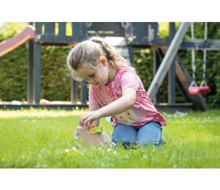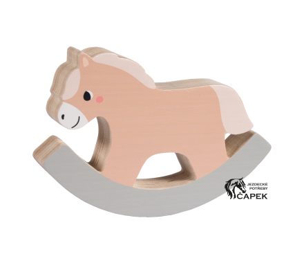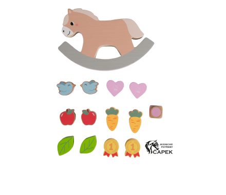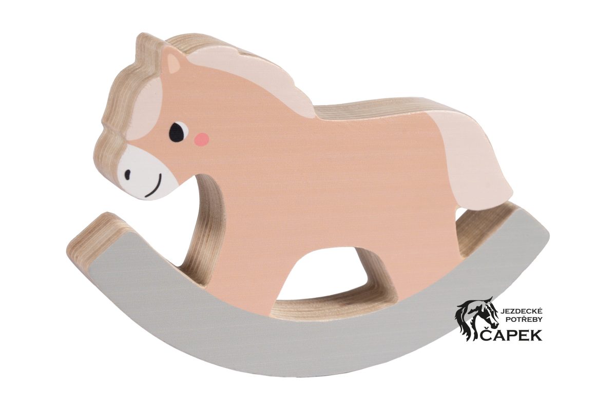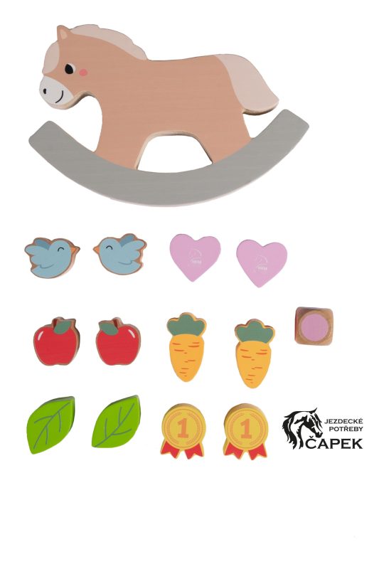 Balační hra ve tvaru houpacího koně vyrobena ze dřeva pro zkrácení dlouhé chvíle těch nejmenších.