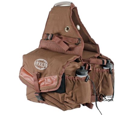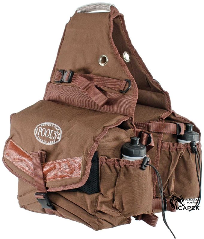 Zadní prostorné sedlové brašny s lahvemi na vodu.
