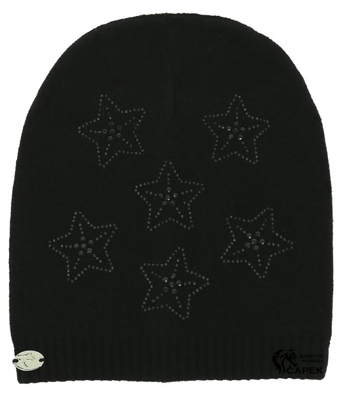 Pletená čepice pokrytá třpytivými kameny ve tvaru hvězd.