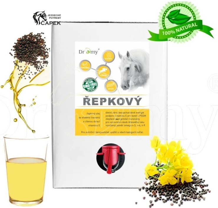 Za studena lisovaný řepkový olej pro podporu trávení, zlepšení energetické rovnováhy, vyrovnání zásob tělesného tuku, zlepšení stavu srsti, pokožky a kopytní rohoviny všech kategorií koní.