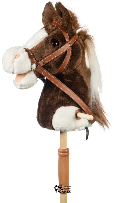 Kůň na dřevěné tyči s držadly a otěžemi.