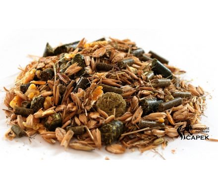 - kukuřičné vločky, pšeničné otruby, granulované seno, vojtěškové úsušky, ječmen, sojový olej, senná řezanka, jablečné výlisky, fenykl obecný, anýz vonný, koriandr setý, sušená mrkev, uhličitan vápenatý, kukuřice, sojové boby, extrudovaný len, dihydrogenfosforečnan vápenatý, dihydrogenfosforečnan sodný, chlorid sodný, síran hořečnatý, inaktivované kvasinky rodu Saccharomyces cerevisiae 2385 mg/kg, sušená řasa Schizochytrium limacinum 265 mg/kg