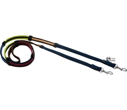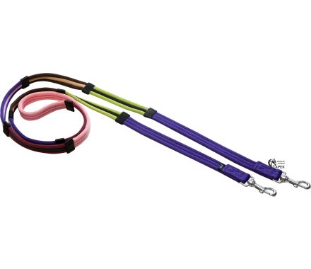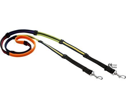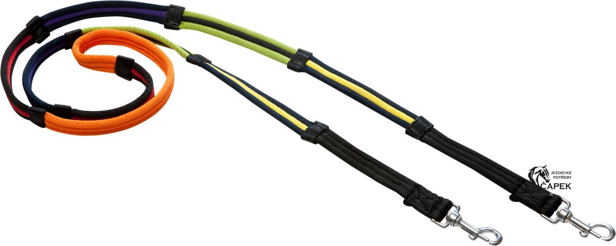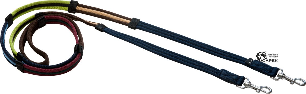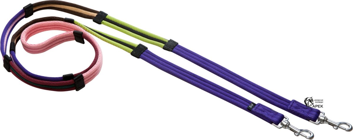 Polstrované otěže z polyesteru, rozdělené do 4 sekcí různých barev se zarážkami.