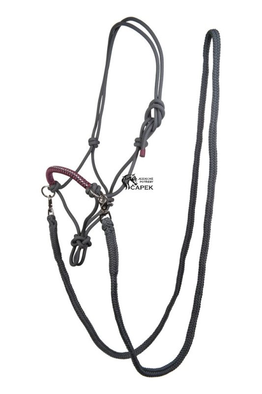 Provazová ohlávka zdobená opletem a kamínky v sadě s otěžemi.