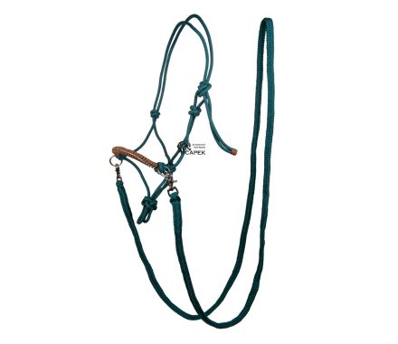 Provazová ohlávka zdobená opletem a kamínky v sadě s otěžemi.