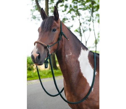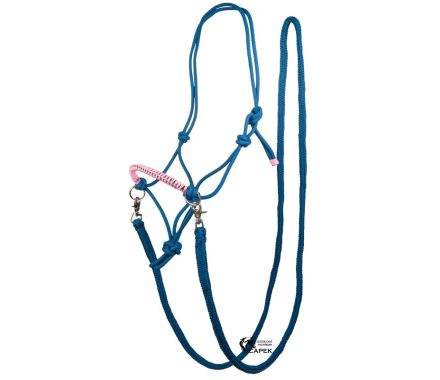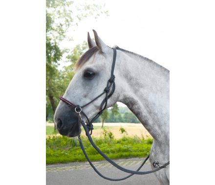 Provazová ohlávka zdobená opletem a kamínky v sadě s otěžemi.